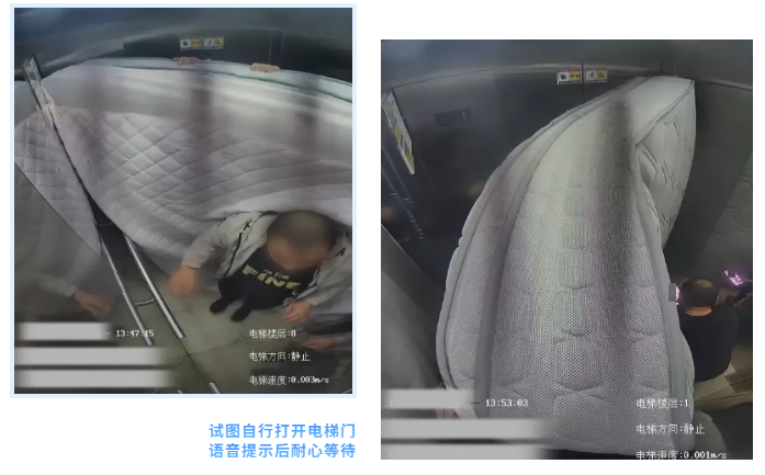 床架绵亘轿厢,新再灵科技的电梯物联网设备展示了其快速识别梯内非常环境并应急响应救援的能力。存正在数据畅后、误报率高、及时性差等问题。监测到一路令人啼笑皆非的电梯困人事务:两名须眉试图将一张未压缩的床垫搬入电梯,实现数据及时上传取智能阐发,比拟保守救援模式响应更为及时。幸运的是,通过语音播报安抚被困者情感。
